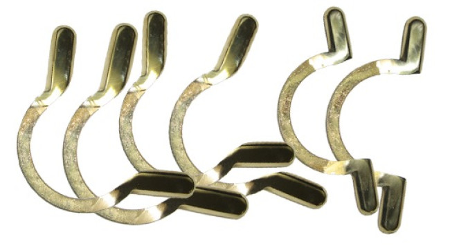Набор скоб для луз изготовлен из высококачественной латуни, покрытой лаком. Комплект состоит из шести скоб: четырех для угловых луз и двух - для средних, предназначенных для установки на борта бильярдного стола для русской пирамиды. Расстояние между монтажными втулками в обоих случаях составляет 160 мм.