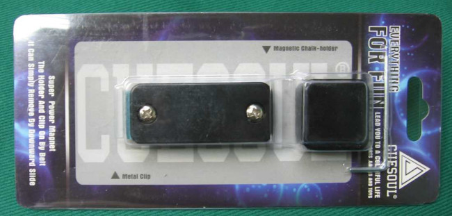 Держатель «Cuesoul» предназначен для комфортного использования бильярдного мела в процессе игры. Используя держатель, игроку нет необходимости отвлекаться на поиски мела в процессе игры, и он будет независим от качества мела в клубе, пользуясь собственным мелом, которому он доверяет. Держатель включает в себя пластиковый контейнер, на который устанавливается мел, и клипсу с винтом крепления мелка, которая соединяется с контейнером с помощью магнита. В комплекте держателя предусмотрен металлический ключ шестигранник для надёжной фиксации мелка в клипсе! Контейнер устанавливается на пояс или ремень игрока. Держатель поставляется без мелка!