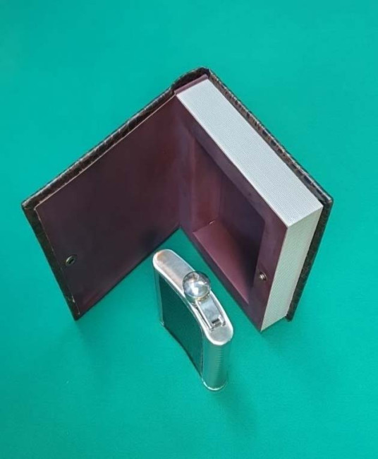 Книга - футляр кожзам с фляжкой. Табличка с гравировкой: Пособие для профессиональной игры в бильярд. Читать рекомендуется "на троих"!