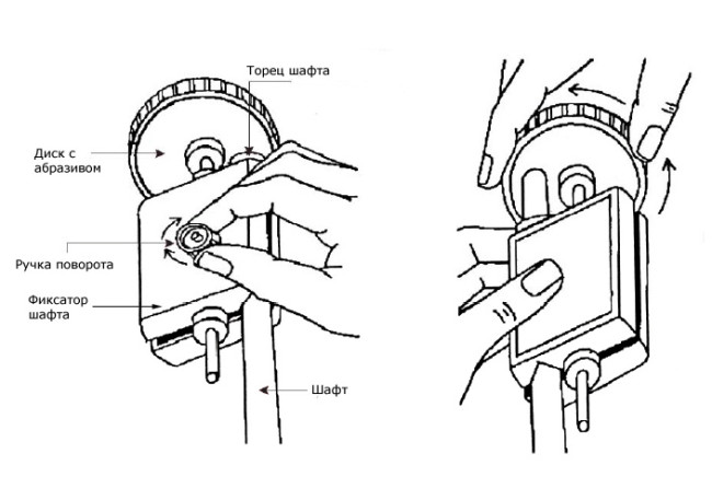 Установите на станок диск с абразивом так, чтобы абразив соприкасался с торцом шафта;