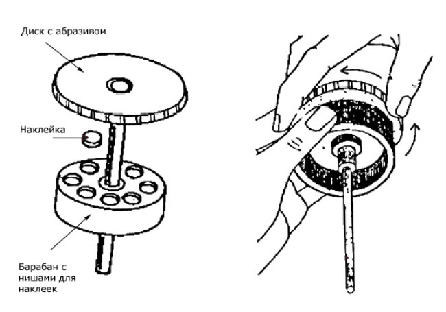 Вновь соедините диск с барабаном так, чтобы абразив, находящийся на внутренней стороне диска, соприкасался с наклейками;