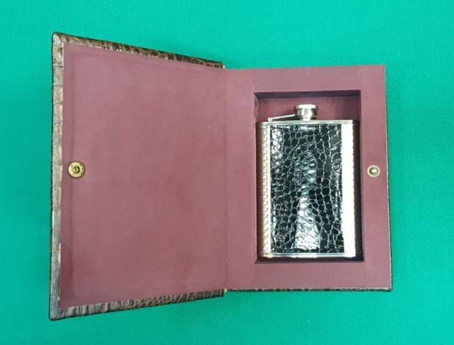 Книга - футляр кожзам с фляжкой. Табличка с гравировкой: Пособие для профессиональной игры в бильярд. Читать рекомендуется "на троих"!
