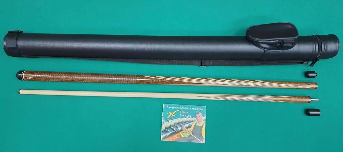 Комплектность: Логотип - значок "КС" выполненный из серебра 999 пробы, весом 1,2 гр., жёсткий тубус, номерной паспорт, защитные колпачки для скруток. Присутствует нанесённый узор на рукоятку кия - гравировка "Кожа ската" позволяющий увеличить коэффициент трения в месте хвата кисти игрока. Таким образом, в момент замаха и удара повышается комфортность игры.